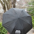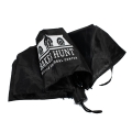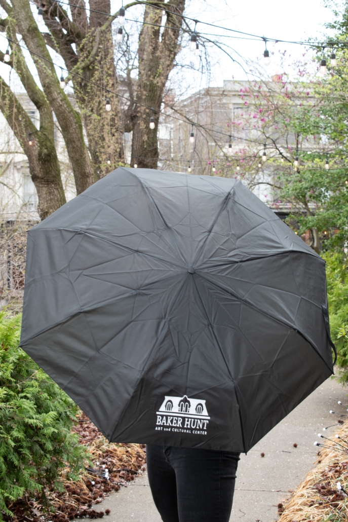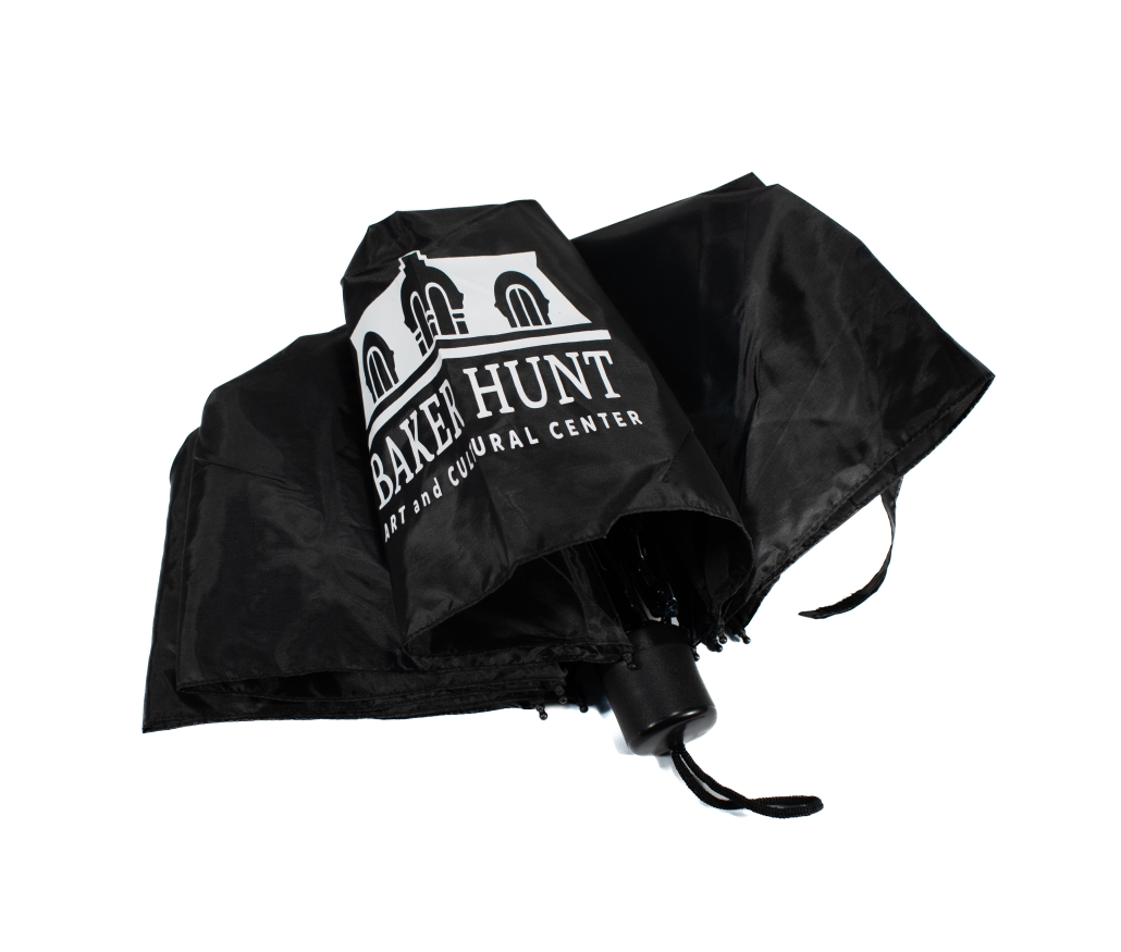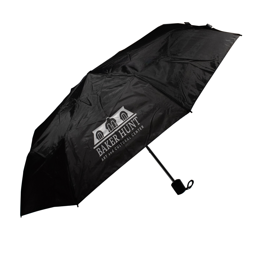 The folding umbrella has a printed Baker Hunt logo. This water resistance with button pushes and folding umbrella offers a sufficient 42-inches arc. Features an eight-panel durable polyester canopy with a matching sleeve and velcro tie strap for easy and neat storage.