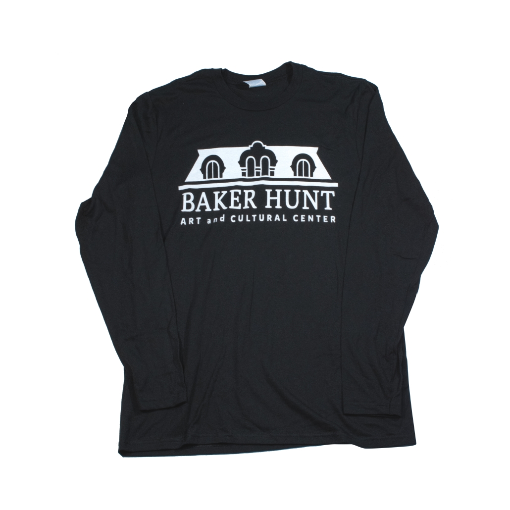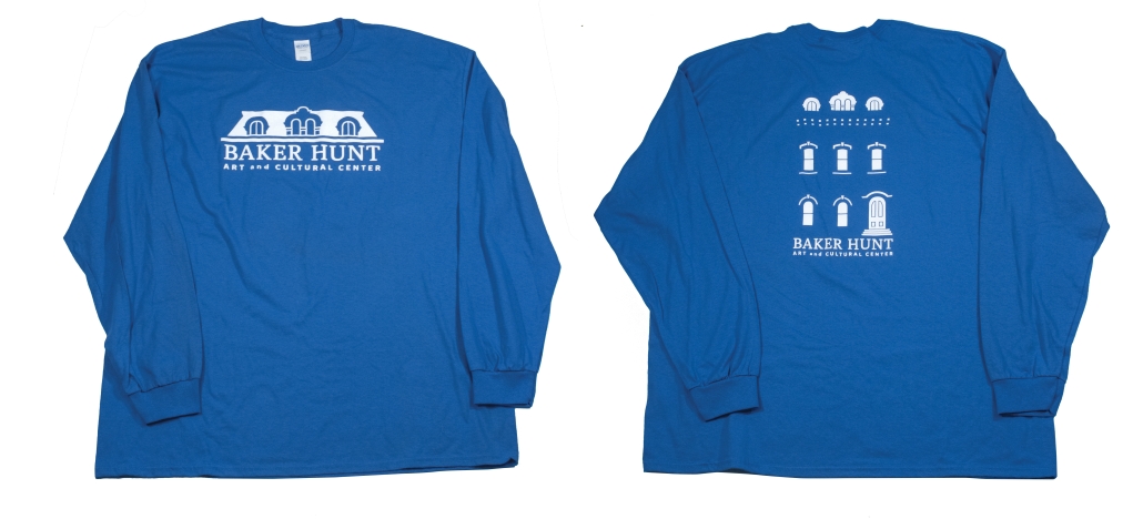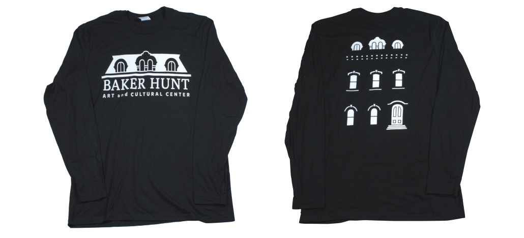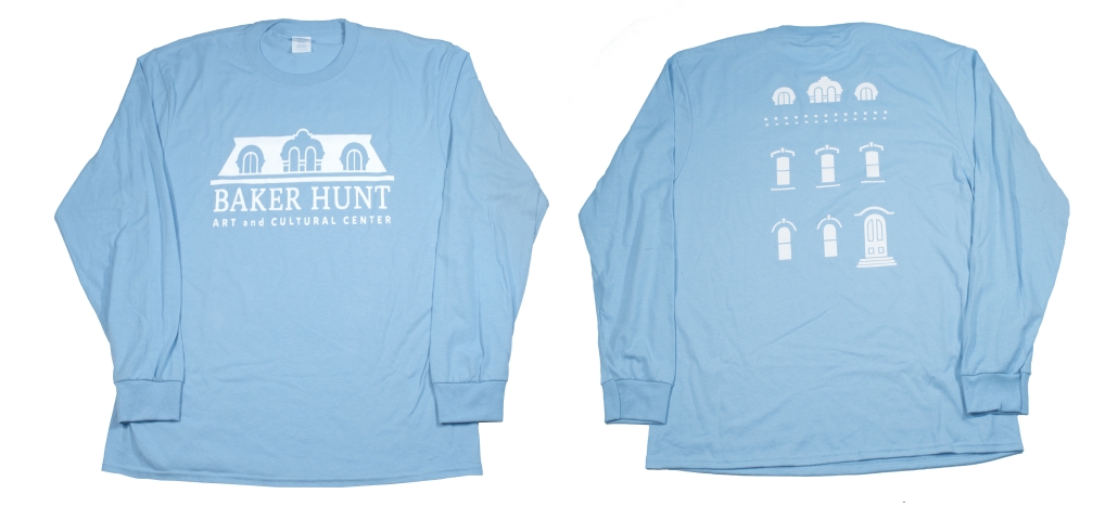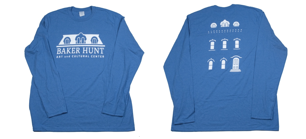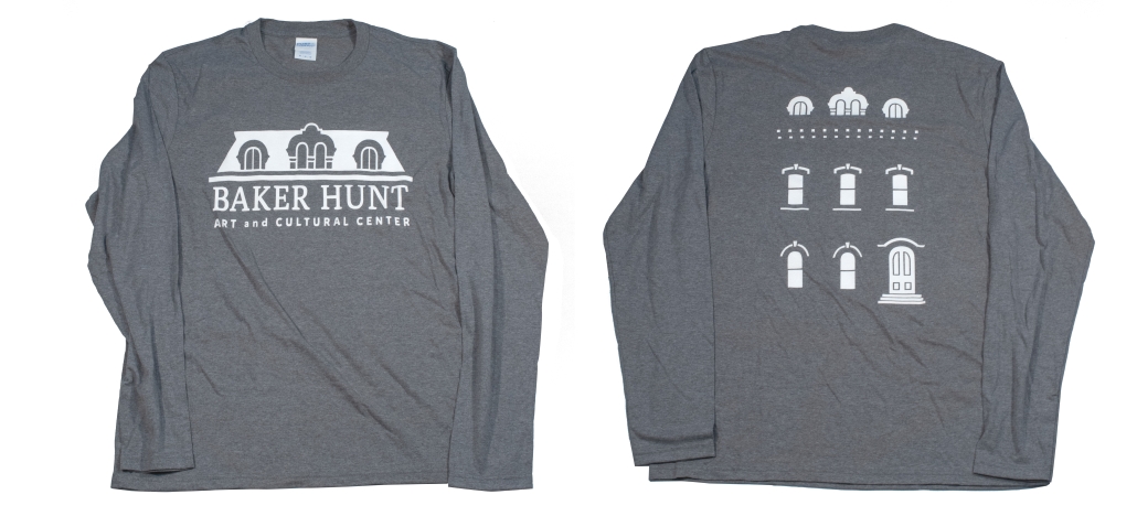 Baker Hunt classical logo t-shirts feature “Baker Hunt Art & Cultural Center” along with the logo on the front. The back showcases graphic designs of the signature doors, windows, and roof of the Baker Hunt building. These unisex t-shirts are versatile and easy to wear, made from a comfortable stretchy cotton blend. They are great for pairing with various outfits, allowing you to support the community while adding a fun piece to your wardrobe.