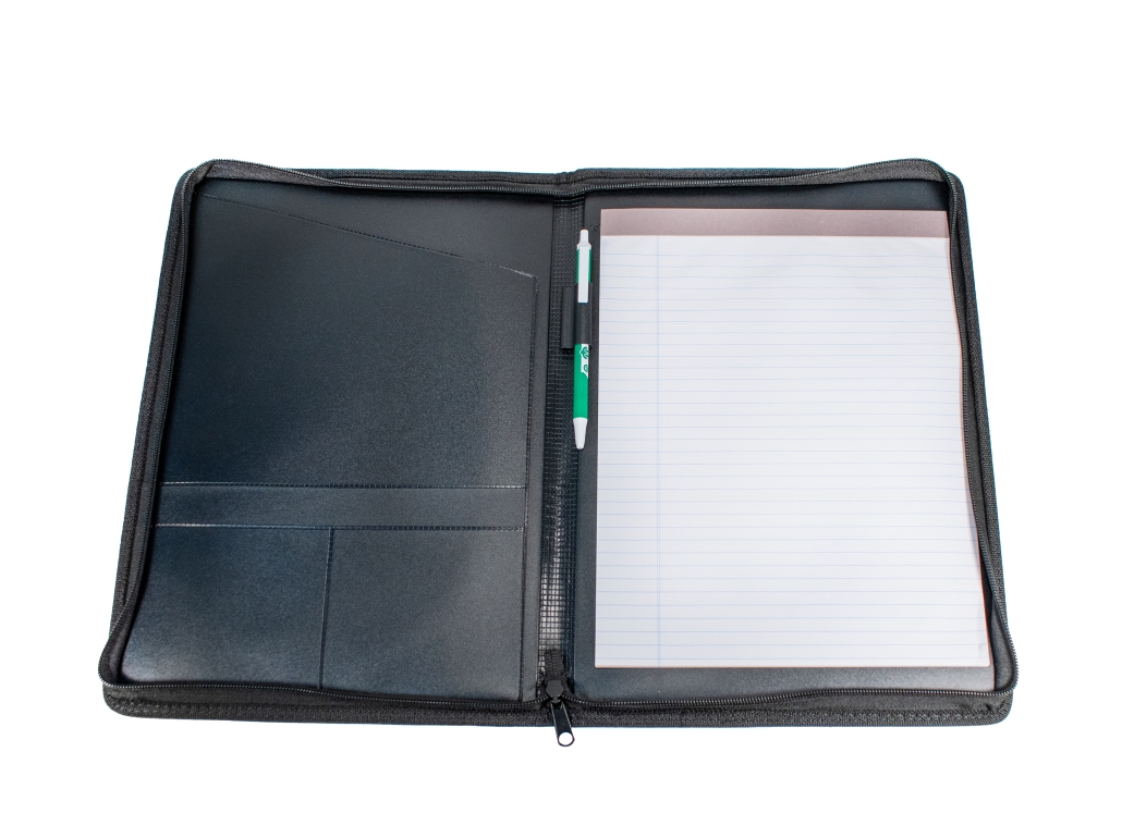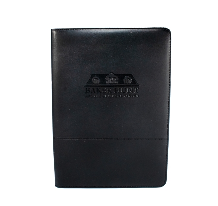 The Baker Hunt zippered padfolio features our debossed logo and includes a lined writing pad, as well as vinyl interior pockets for miscellaneous notes. It comes with a Baker Hunt pen that can be conveniently attached to a pen loop. The smooth zippered closure ensures that all of your documents and notes remain secure.