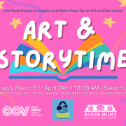 Join Baker Hunt and Read Ready Covington for a FREE art and storytime! Children ages 4-6 (and siblings) will enjoy a different book each week, read by a guest storyteller, then have a fun time making themed art with our Baker Hunt instructors! We end with play time outside!